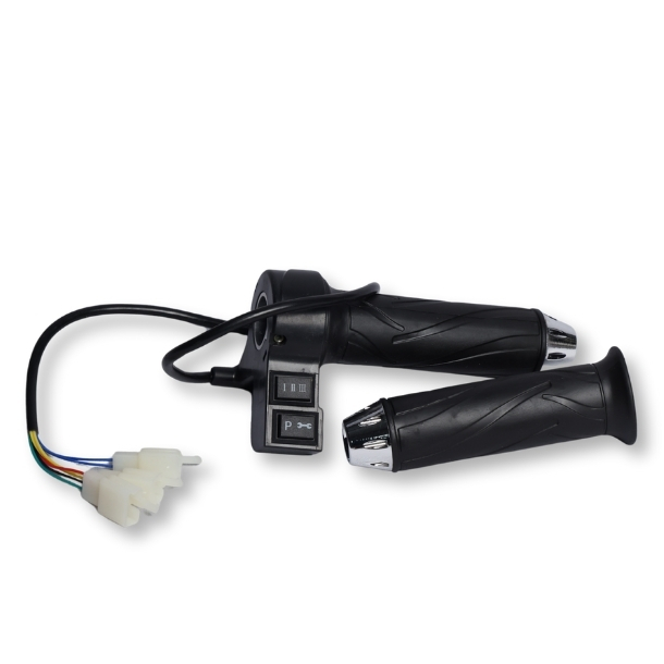 Double push EV throttle with waterproof switches and chrome finish, designed for smooth and reliable control in electric scooters and e-bikes.